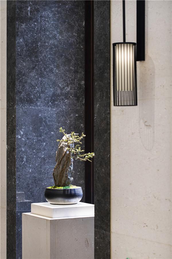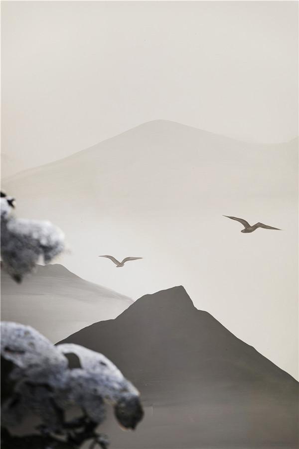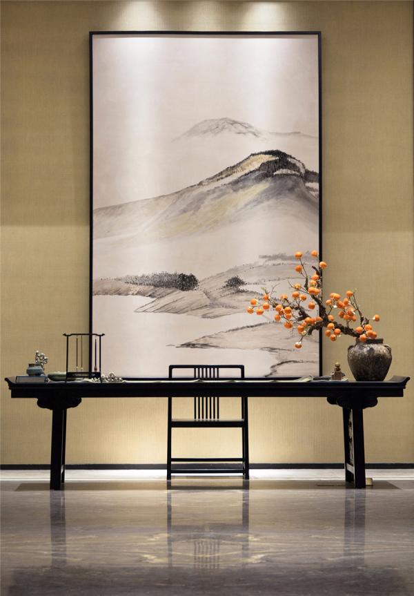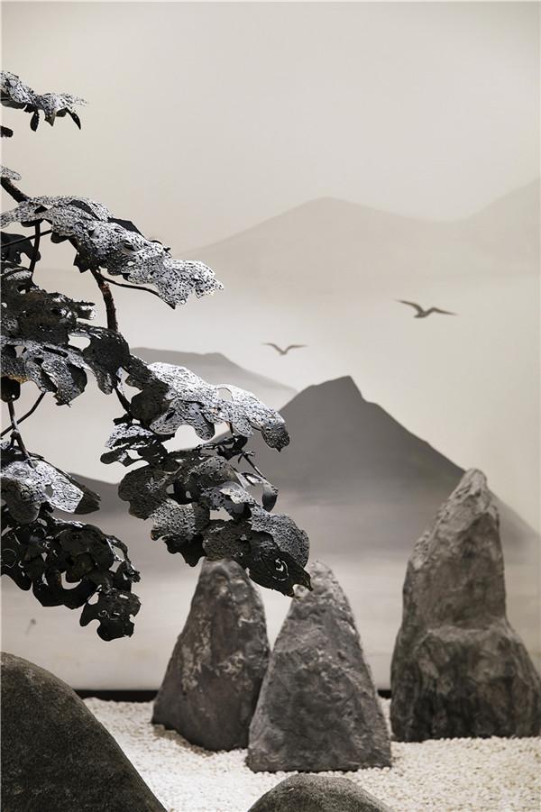 移步下階,見水墨山川順沿蜿蜒周折的樓梯走勢(shì),盤旋錯(cuò)落。云霧縹緲間,紅楓葉落,勁松蒼翠,山巒疊嶂,意境雅雋。山石與蒼松的精巧端景,映襯著山水畫的意境,人文自然的隱逸美散落在虛實(shí)之間,自在由心。