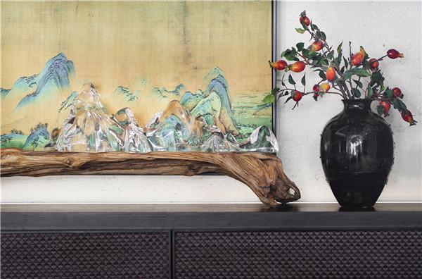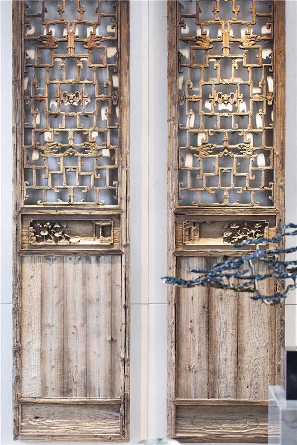 禪茶室中,當(dāng)?shù)刂窬幪旎ㄣ暯有沃聘鳟惖氖肿髦裰茻麸?,鋪展開一室古雅清愜。以舊瓦堆疊的墻面帶著歲月的紋路,斑駁光影點(diǎn)染老木頭細(xì)雕雙龍、花木的窗欞,萬里江山圖與透明山石小景的虛實(shí)映襯,豐盈了這份古典況味。