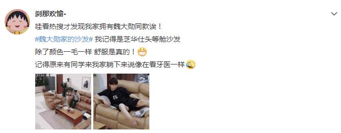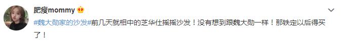 粉絲“剎那歡愉”表示:“哇 看熱搜才發(fā)現(xiàn)我家擁有魏大勛同款沙發(fā)”;“肥瘦mommy”表示前幾天就相中的芝華仕搖搖沙發(fā)!沒有想到跟魏大勛一樣,那鐵定以后得買了。