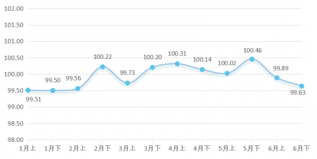 2019年一季度,南康實木家具價格整體波動上行;2019年上半年,南康實木家具價格指數(shù)圍繞100點小幅波動,整體微漲。其中,2019年春節(jié)期間家具市場交易火爆,家具買家購入意愿較高;3月下價格指數(shù)收于100.20點,一季度上漲0.69%,家具價格行情看漲。