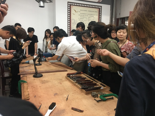 第三站:實(shí)地參觀龍順成“京作”家具制作各工序,并由龍順成“京作”家具制作傳承人結(jié)合不同工序的特點(diǎn)進(jìn)行現(xiàn)場(chǎng)解說(shuō)及演示。作為京作硬木技藝的核心,以不用一根鐵釘拼接、能使成百上千年而在人類(lèi)輕工制造史上堪稱奇跡。