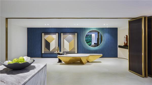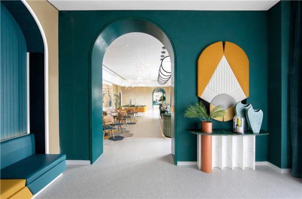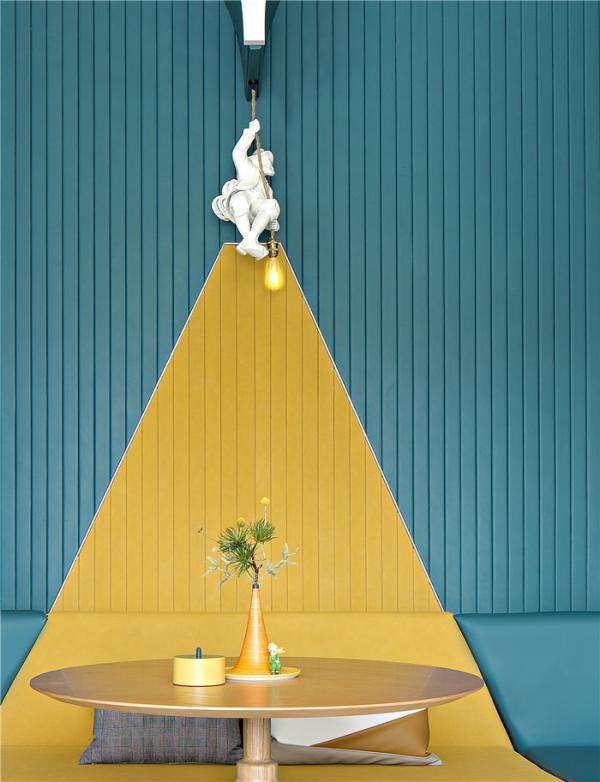 空間最大的亮點在于墻面色彩的運用,亮麗明朗的黃調在燈光的映襯下,酒紅、碧綠與墨藍色調的點染,加深了空間氣質對比的濃烈程度,營造出一個藝術表現力彌漫的場域。