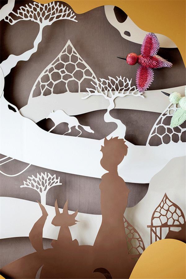 紙雕藝術結合了繪畫和雕塑之美,于平面與立體的組合中,將自然森林的意境濃縮進一幅紙雕背景畫里,在自然化與感官化的兒童視角下,草木蔥郁,飛鳥駐足,生機盎然的叢林里的日出日落,畫面純美而輕松舒適。