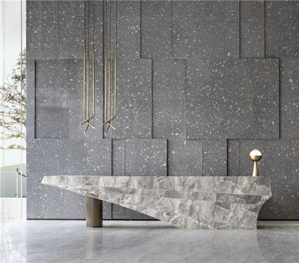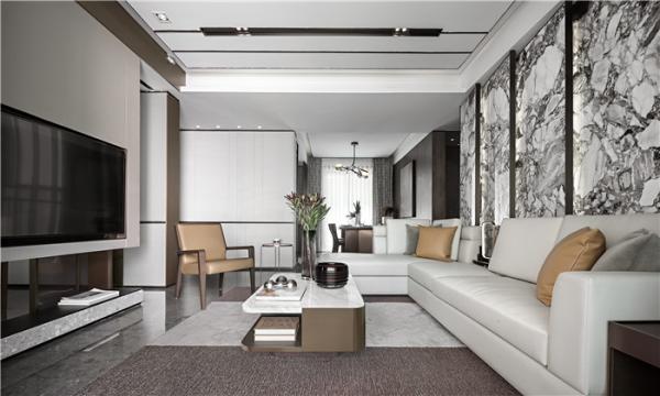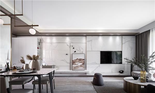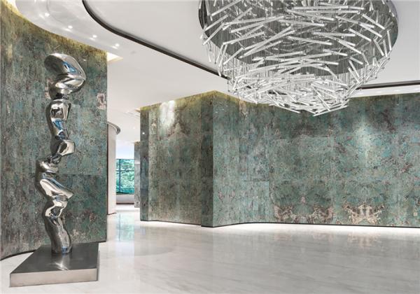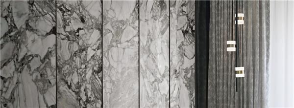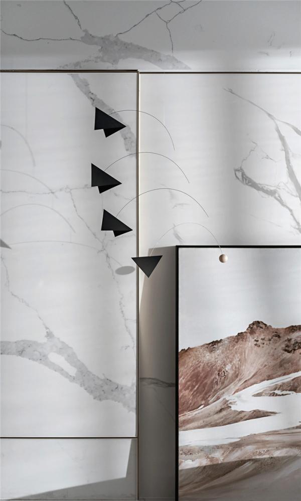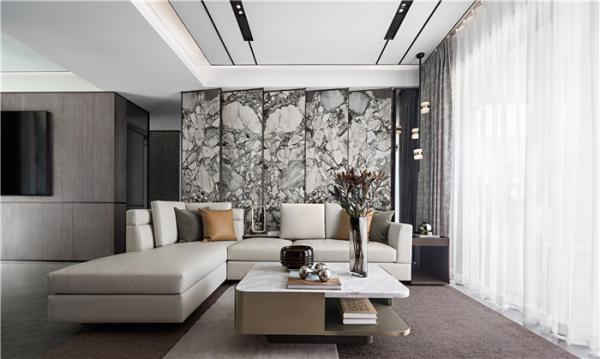引自然入空間,創(chuàng)造了一種情緒化的抽象形式,將色彩、形狀、平衡、深度、構(gòu)成、尺度、觸感等形式因素的重新解讀。綠翡翠石材序列層疊陣列的沙發(fā)背景墻、米色捫皮電視背景造型、意大利灰石材陳鋪地面、灰色木飾面與墻布硬包都賦予空間別樣的生活情趣與藝術(shù)的玩味基調(diào)。