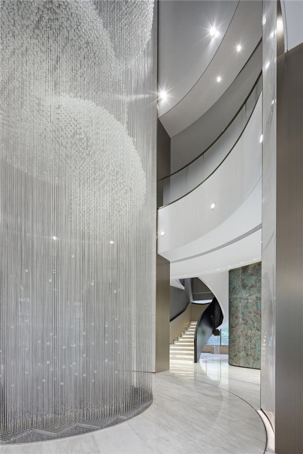 皮革編織呈現(xiàn)出的意式經(jīng)典工藝與雋永低調(diào)的奢華風(fēng)范恰恰迎合現(xiàn)代人的審美情趣,將皮革編織的作為勾連空間的靈魂元素,在細節(jié)上把控內(nèi)斂的氣質(zhì)。同時把意識流和解構(gòu)主義的手法融入創(chuàng)作中:結(jié)合不同的施工工藝,在空間上做了不同材質(zhì)的拼接與碰撞,每一處細節(jié)都截然不同,唯一編織元素在潛意識里貫穿始終。