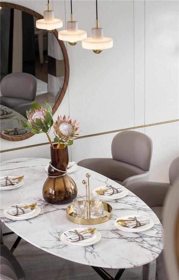 為了更加凸顯空間氣質(zhì),將家具的造型做減法,用簡約明了的線條與呼應(yīng)空間的質(zhì)感,家具材質(zhì)的選擇同樣結(jié)合空間調(diào)性去考量,讓空間在不同維度上達到和諧統(tǒng)一。