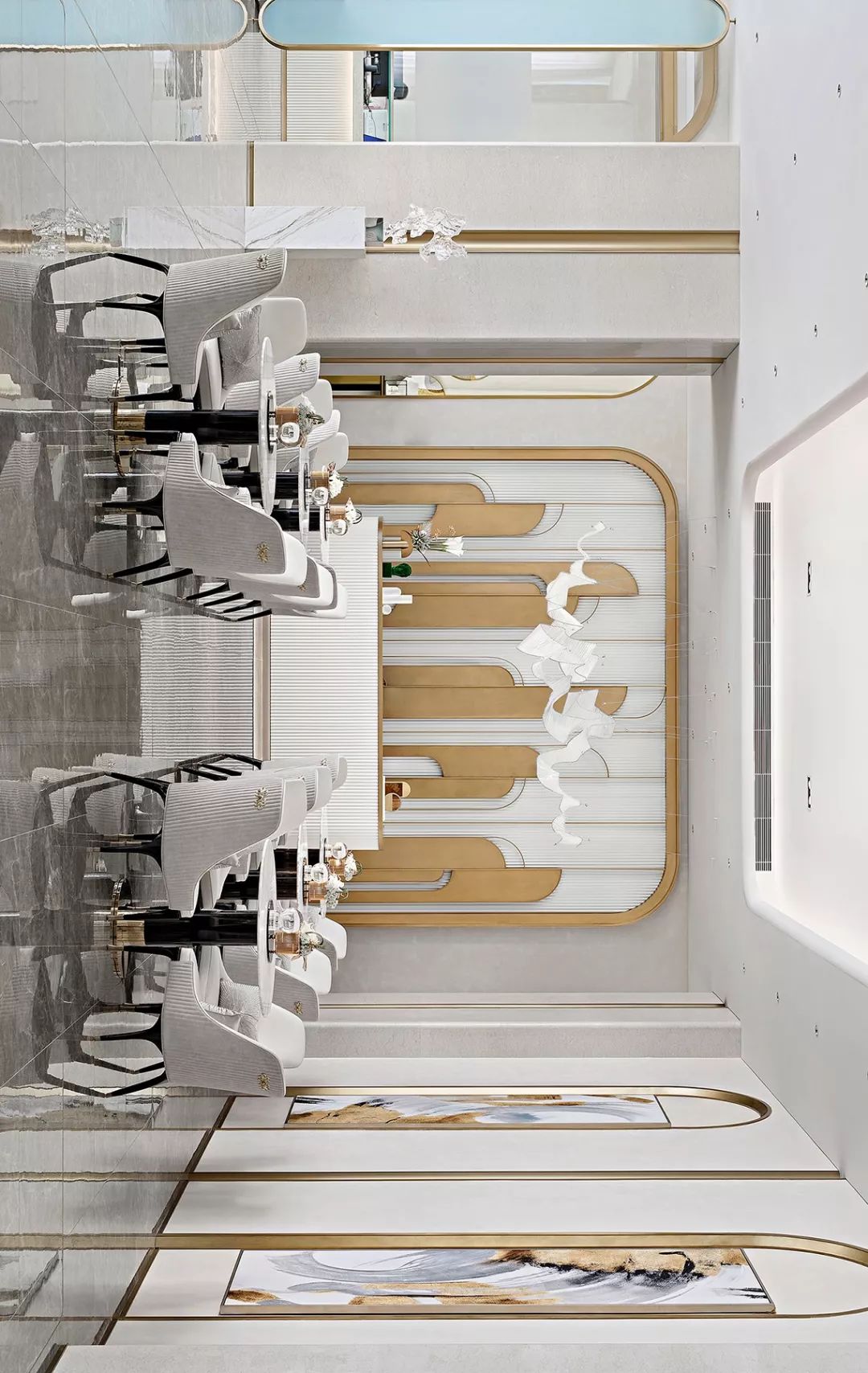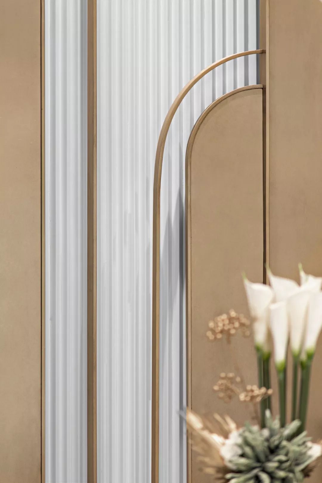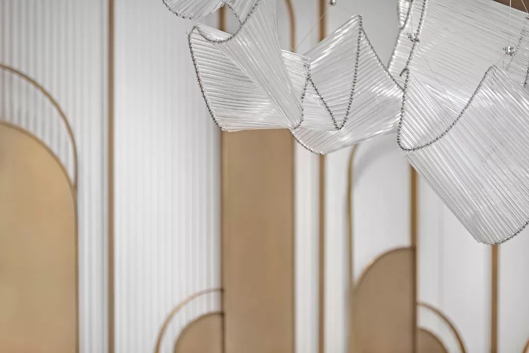 白凈的折線與拱形的金屬形成兩種極致的對白與呼應(yīng),設(shè)計(jì)師以無窮的想象把無意識的行動(dòng)轉(zhuǎn)化為可見之物,將物體的輪廓用藝術(shù)語言再度改編,理性與感性的交疊與平行中,用設(shè)計(jì)為售樓中心全新賦能。