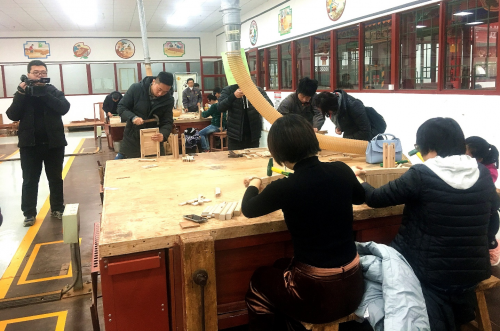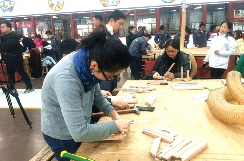 第三站:實地參觀龍順成“京作”家具制作各工序,并由龍順成“京作”家具制作傳承人結(jié)合不同工序的特點進行現(xiàn)場解說及演示。作為京作硬木技藝的核心,以不用一根鐵釘拼接、能使成百上千年而在人類輕工制造史上堪稱奇跡。