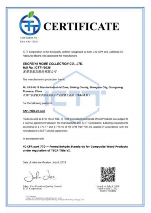 美國(guó)環(huán)境保護(hù)署頒發(fā)的EPA(NAF)無(wú)醛豁免認(rèn)可