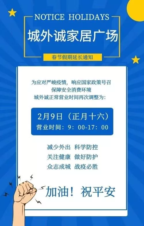 2020年1月29日,城外誠家居廣場宣布,為應(yīng)對嚴(yán)峻疫情,響應(yīng)國家政策號召,保障安全消費(fèi)環(huán)境,城外誠正常營業(yè)時(shí)間調(diào)整為2月9日(正月十六);