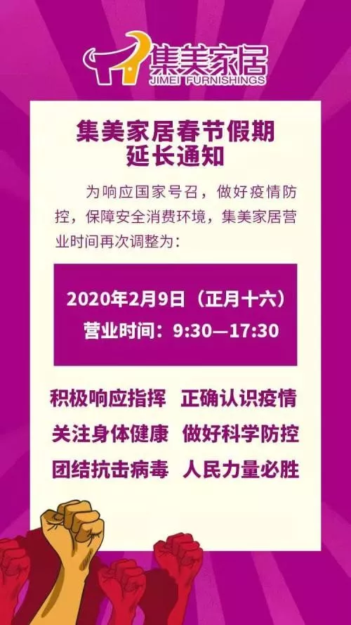 2020年1月29日,集美家居發(fā)布《關(guān)于節(jié)后統(tǒng)一延遲營業(yè)時(shí)間的決定》,集美家居賣場節(jié)后營業(yè)時(shí)間統(tǒng)一調(diào)整為2020年2月9日(正月十六);