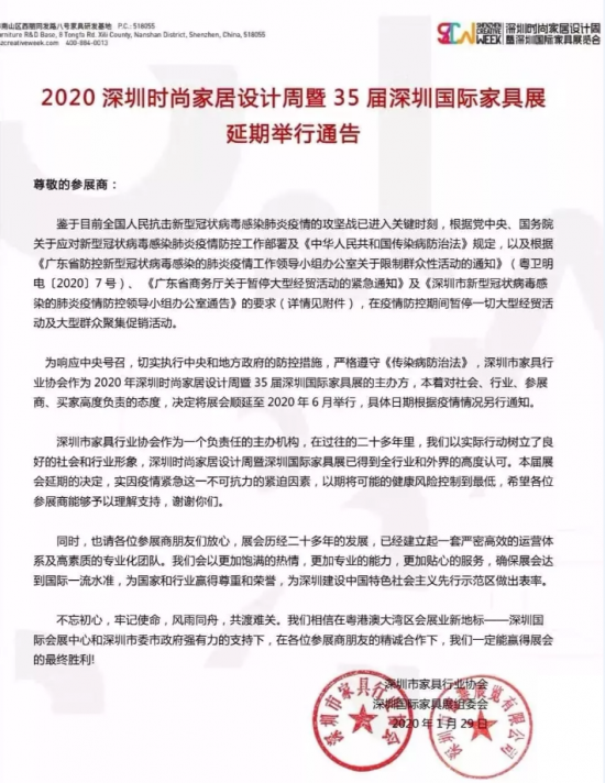 2020年1月29日消息,為響應(yīng)中央號召,深圳市家具行業(yè)協(xié)會作為2020年深圳時(shí)尚家居設(shè)計(jì)周暨35屆深圳國際家具展的主辦方?jīng)Q定將展會順延至2020年6月舉行,具體日期根據(jù)疫情情況另行通知。