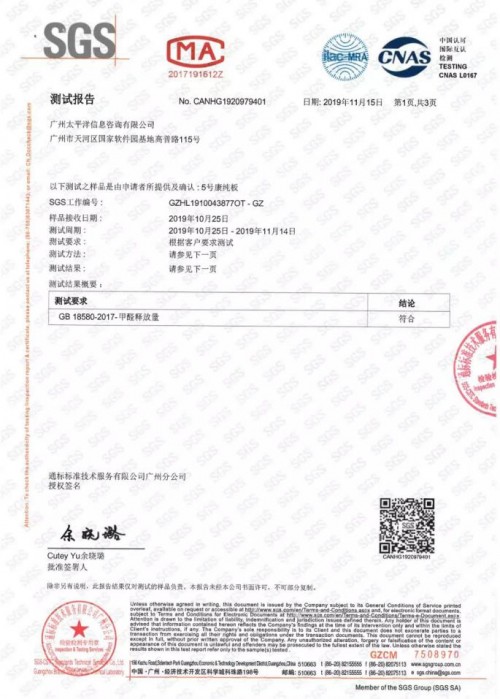 索菲亞綠色環(huán)保板材康純板自2016年推出以來,滿足了客戶居家健康需求,深受青睞。近日,康純板受邀參與測評,通過了全球領(lǐng)先的檢驗、鑒定、測試和認(rèn)證機構(gòu)SGS多項測定,這是繼去年獲得美國EPA(NAF)無醛豁免認(rèn)可后,又一項國際認(rèn)可。