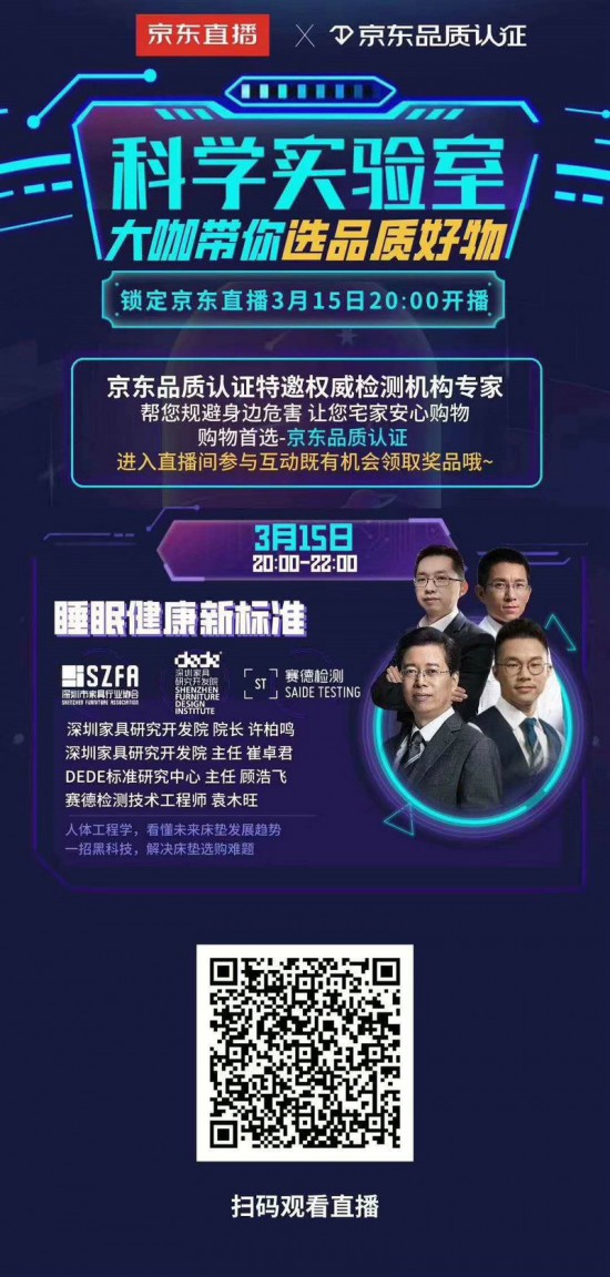 于是,電商巨頭京東和深圳時(shí)尚家居設(shè)計(jì)周全面牽手,以品質(zhì)為核心,以高標(biāo)準(zhǔn)和獨(dú)特標(biāo)準(zhǔn)為基礎(chǔ),聯(lián)合深圳家具研究開(kāi)發(fā)院標(biāo)準(zhǔn)研究中心,深圳市賽德檢測(cè)技術(shù)有限公司作為技術(shù)單位,打造了一系列線上線下活動(dòng)。用專業(yè)檢測(cè),為消費(fèi)者提供更有權(quán)威和說(shuō)服力的品質(zhì)產(chǎn)品,這是京東和深圳時(shí)尚家居設(shè)計(jì)周達(dá)成戰(zhàn)略合作的契機(jī),也是3月18日這場(chǎng)“好睡眠、新標(biāo)準(zhǔn)”線上發(fā)布會(huì)如此吸睛的原因。此次發(fā)布會(huì)由京東家具、深圳市家具行業(yè)協(xié)會(huì)、深圳時(shí)尚家居設(shè)計(jì)周發(fā)起,深圳家具研究開(kāi)發(fā)院標(biāo)準(zhǔn)研究中心,深圳市賽德檢測(cè)技術(shù)有限公司作為技術(shù)單位聯(lián)合推出。