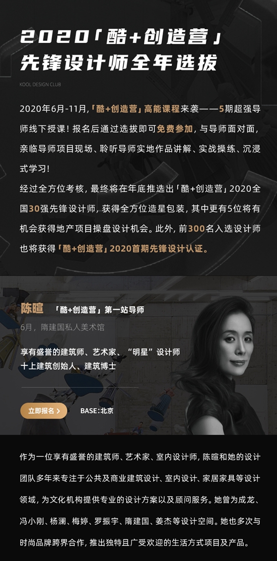 6月23日,新浪家居攜手酷家樂(lè)打造的「酷+創(chuàng)造營(yíng)」第一站即將走進(jìn)北京,并邀請(qǐng)明星御用設(shè)計(jì)師陳暄帶領(lǐng)25位先鋒設(shè)計(jì)師,共同探訪這座極少對(duì)外開(kāi)放的美術(shù)館——隋建國(guó)美術(shù)館,而這25位先鋒設(shè)計(jì)師可能就有你一席!(報(bào)名方式見(jiàn)文末)