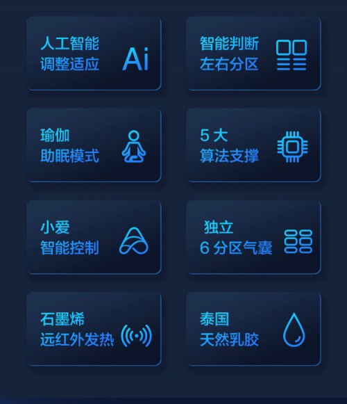 同時(shí)具有,5大算法支撐,小愛智能控制,獨(dú)立6分區(qū)氣囊,石墨烯遠(yuǎn)紅外發(fā)熱等功能。具有很強(qiáng)烈的科技感。