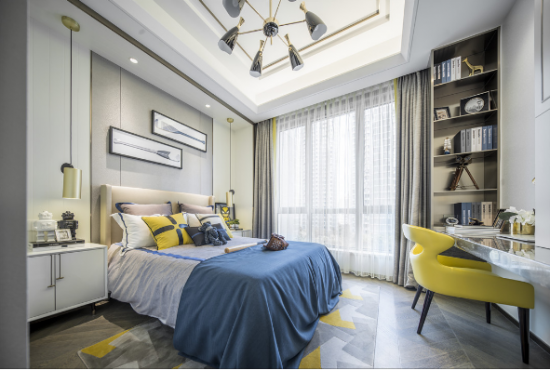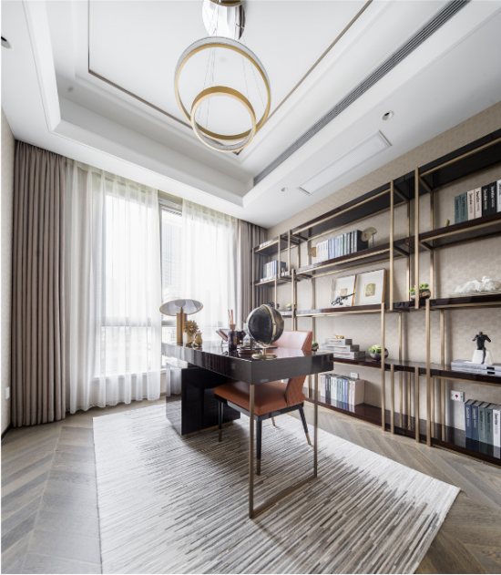 【黃柏元】:該作品因位于上海浦東陸家嘴高級(jí)地段,建筑在外觀設(shè)計(jì)上就很時(shí)尚,全部外墻采用鋁板現(xiàn)代設(shè)計(jì),所以我們?cè)谑覂?nèi)設(shè)計(jì)上也延續(xù)了這一特點(diǎn),都采用現(xiàn)代、輕奢、時(shí)尚的設(shè)計(jì)。當(dāng)然因我們作品的定位人群是高端中年族群,所以我們?cè)谠O(shè)計(jì)風(fēng)格上出了時(shí)尚輕奢外,也加入了一些現(xiàn)代簡(jiǎn)歐元素,讓現(xiàn)代與古典融合,賦予了作品幾分貴族氣息。