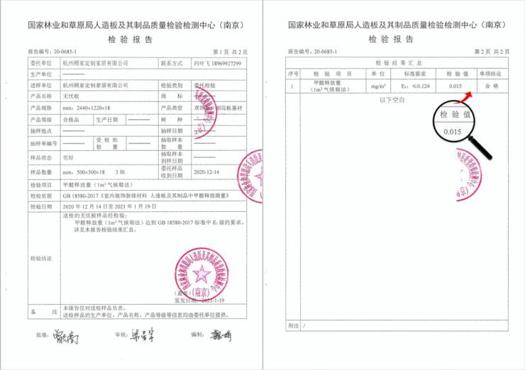 從環(huán)保性能上來看,健康原木定向板保留天然木材本身的味道,經(jīng)國家林草局人造板及其制品質(zhì)量檢驗檢測中心檢測,通過1m³氣候箱法測試后的甲醛釋放量僅為0.015mg/m³,環(huán)保性能遠優(yōu)于E1級國標8倍,達到無醛人造板級別。健康原木定向板基材憑借過硬品質(zhì)更是一舉囊括美國CARB NAF和EPA NAF兩項無醛豁免認證,從源頭杜絕甲醛危害,為孕婦、新婚夫婦、老人和小孩四類甲醛敏感人群帶來健康呵護。②