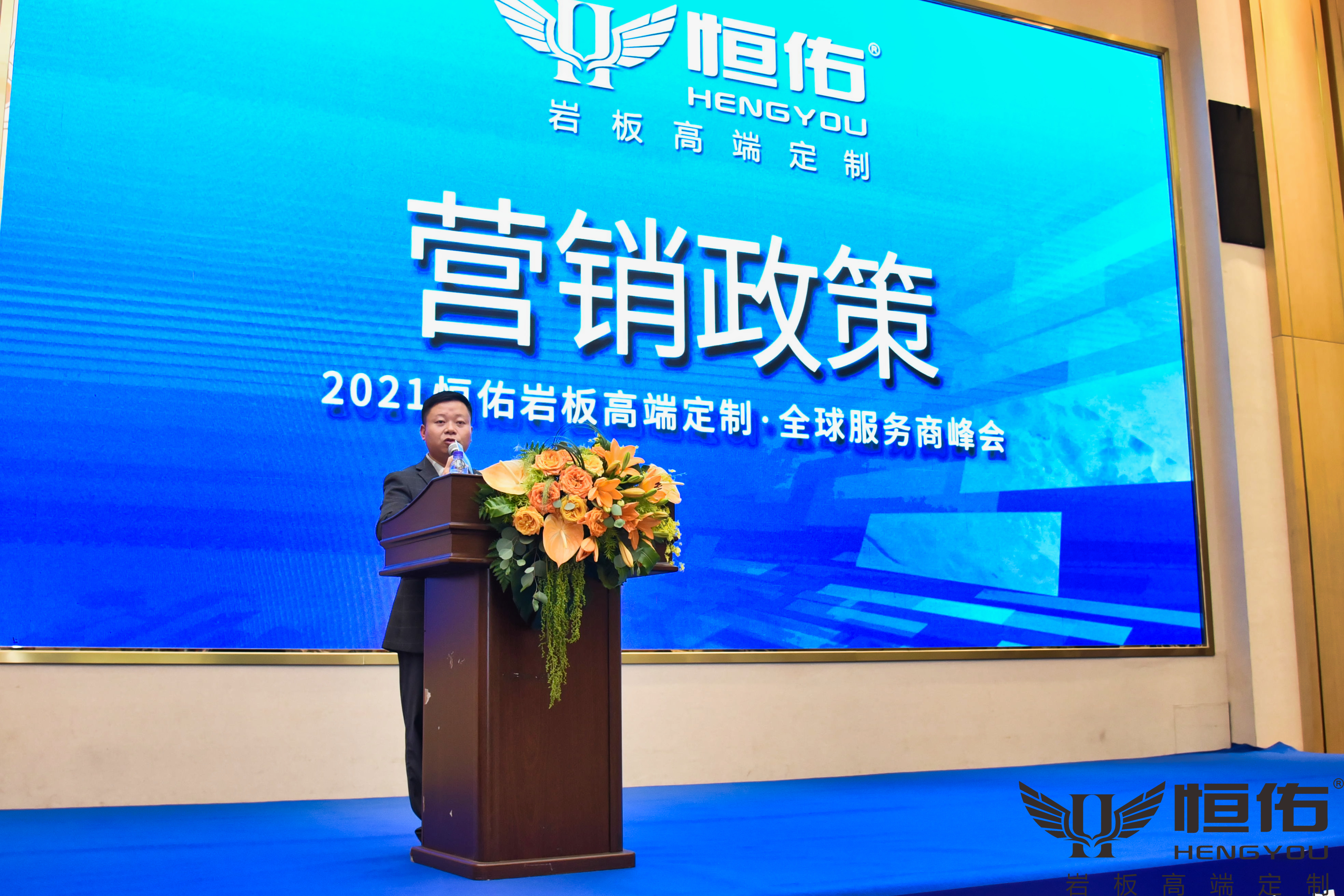 合作是服務(wù)的開始,峰會最后,恒佑巖板高端定制品牌總監(jiān)劉總再次上臺,從渠道布點(diǎn)、價格管理體系到營銷推廣和建立共贏模式,梳理出清晰的發(fā)展方向和合作模式,對2021年巖板合作營銷政策進(jìn)行了宣講和解讀,將峰會推向高潮。