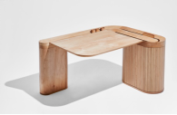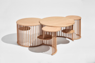 在被隔離的這段時間里,Shin意識到:“物體可以在不尋常的情況下幫助人們增強適應能力。”這一想法是他作品的基礎。在“宜家效應”(消費者會對自己創(chuàng)造的產(chǎn)品給予更高的價值)的指導思想下,他想到了一種半成品設計,用戶可以將部分家具進行組裝,以加強與家具間的互動。他創(chuàng)作了一張小桌子,通過巧妙而簡單的連接方式(無需膠水)進行組合,可變成一個堆疊式的貨架裝置,結(jié)構(gòu)靈活,適用于不同的空間。Shin選擇美國硬楓木,因為其木材的密度,可以在不壓碎木材纖維的情況下,將接頭移入和移出。