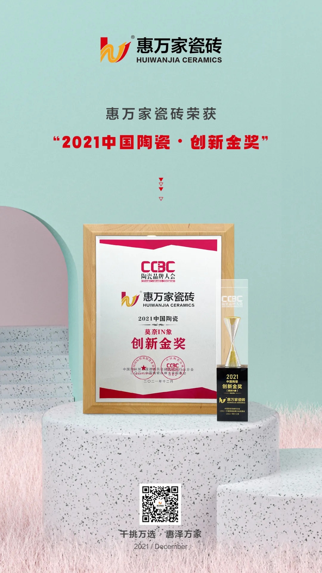 惠萬(wàn)家瓷磚憑借頭部陶企深厚設(shè)計(jì)底蘊(yùn)、龐大的研發(fā)團(tuán)隊(duì),強(qiáng)大的自主創(chuàng)新研發(fā)能力,在眾多品牌中脫穎而出,榮獲【2021中國(guó)陶瓷•創(chuàng)新金獎(jiǎng)】稱號(hào)。