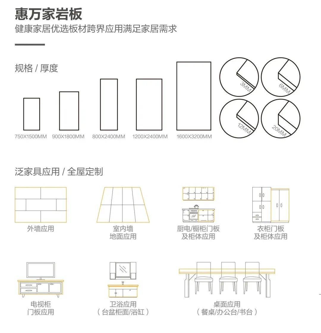 為了進(jìn)一步完善巖板產(chǎn)品定制矩陣,惠萬(wàn)家推出了多種可選尺寸。從1600×3200mm的超大尺寸,以及800×2600mm的豪華規(guī)格,再到“兩片到頂”的750×1500mm黃金比例等等,惠萬(wàn)家?guī)r板以多種尺寸方案適配不同用戶的家居環(huán)境,通過(guò)靈活切割與多元加工,以大規(guī)格、少留縫的鋪貼方式帶來(lái)整潔觀感,讓用戶暢享大氣舒適的居家生活。