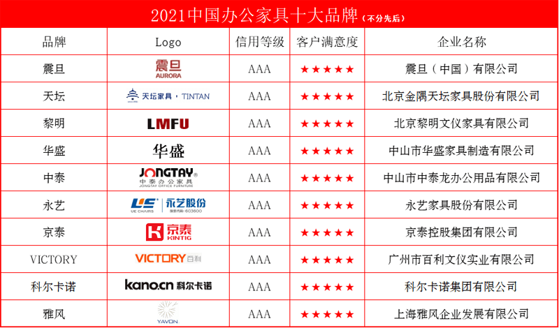 招投標供應鏈品牌推介平臺為推動辦公家具企業(yè)加強品牌建設,提升品牌的知名度和美譽度,擴大辦公家具品牌在招投標市場和消費市場的影響力,特舉辦了“2021中國辦公及商用家具評價推介”活動,據(jù)悉,此活動受到業(yè)內(nèi)及社會各界人士的廣泛關(guān)注和熱情參與,參評展示家具知名品牌企業(yè)510余家,網(wǎng)絡公眾滿意度市場調(diào)查投票共達829.3262萬余票。各參評企業(yè)數(shù)據(jù)由機構(gòu)推薦、企業(yè)自薦、大數(shù)據(jù)采集構(gòu)成,并由來自質(zhì)檢、環(huán)保、認證、行業(yè)協(xié)會等專家對各參評品牌企業(yè)進行了綜合評審,“震旦”、“天壇”、“黎明”、“華盛”、“中泰”、“永藝”、“百利”、“京泰”、“科爾卡諾”、“雅風”等品牌憑借優(yōu)異的綜合實力在眾知名品牌中脫穎而出斬獲“2021中國辦公家具十大品牌”供應商,展現(xiàn)了企業(yè)良好品牌形象,充分發(fā)揮品牌引領(lǐng)作用,引領(lǐng)行業(yè)向更健康、更環(huán)保、更生態(tài)方向發(fā)展。具體如下:
