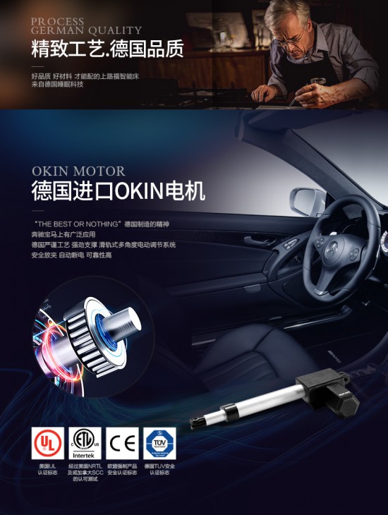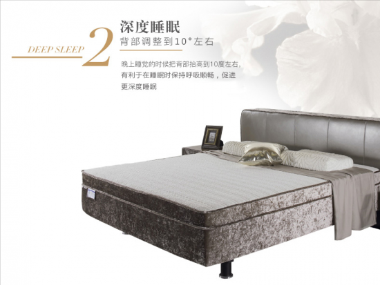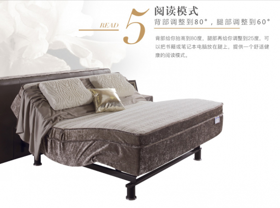 路福S301配備了兩個(gè)德國OKIN電機(jī),背部最高可抬升60°,腿部可抬升至40°,可以滿足多種躺臥姿勢(shì),滿足不同的需求,如閱讀、看電視、辦公、打鼾干預(yù)等。