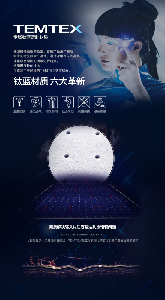 TEMTEX鈦藍(lán)材質(zhì)是路福德國總部與比利時(shí)陸文大學(xué)共同研發(fā)而成的新型材質(zhì),此材質(zhì)是全球唯一能夠解決熱飽和的材質(zhì),也是德國路福特有的材質(zhì),擁有冬暖夏涼的效果,不僅如此,鈦藍(lán)材質(zhì)還是一種能完全貼合身體輪廓的開放性感溫細(xì)胞材質(zhì),會(huì)根據(jù)人體對(duì)床墊表面形成不同壓力自動(dòng)集結(jié),給予身體額外的支撐。