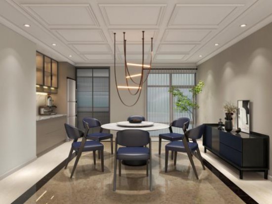 造型別致的吊燈、排列有致的射燈,營造浪漫溫馨的用餐氛圍。CBD家居·黑金 | HZ205餐桌,雙層大理石圓桌面溫潤秀潔,觀感、觸感皆得美的體驗(yàn),靈活旋轉(zhuǎn),讓生活更便捷,黑色錐形臺(tái)柱奠定沉穩(wěn)氣韻,守護(hù)三餐四季。