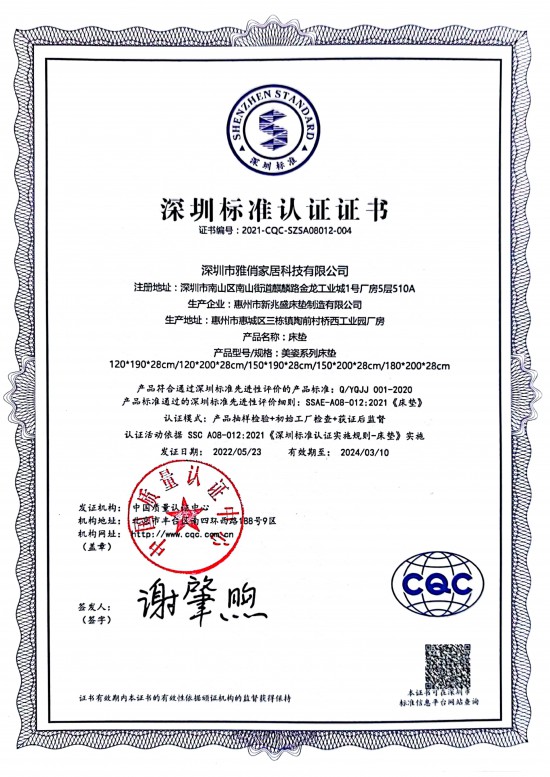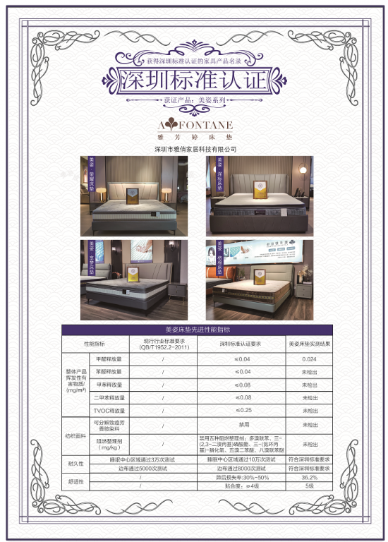 雅芳婷床墊在眾多企業(yè)中榮獲的一家深圳標(biāo)準(zhǔn)認(rèn)證證書的企業(yè),在執(zhí)行深圳標(biāo)準(zhǔn)后,不僅從原材料選擇上提高了質(zhì)量要求,還從產(chǎn)品的結(jié)構(gòu)、性能及工藝研發(fā)技術(shù)方面進(jìn)行了設(shè)計(jì)優(yōu)化,使床墊、床架、沙發(fā)、床頭柜等等產(chǎn)品的品質(zhì)都有了很大的提升。