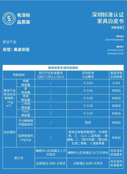 雅芳婷一直將“品質(zhì)”作為企業(yè)的核心競(jìng)爭(zhēng)力,以深標(biāo)標(biāo)準(zhǔn)的“國(guó)內(nèi)領(lǐng)先,國(guó)際一流”的定位,與雅芳婷床墊追求的高品質(zhì)、高質(zhì)量的目標(biāo)不謀而合。全面推進(jìn)標(biāo)準(zhǔn)、設(shè)計(jì)、品牌、信譽(yù)、質(zhì)量‘五位一體’建設(shè),通過(guò)認(rèn)證技術(shù)評(píng)價(jià)手段提升產(chǎn)品質(zhì)量,推動(dòng)深圳標(biāo)準(zhǔn)達(dá)到國(guó)內(nèi)領(lǐng)先、國(guó)際一流水平或填補(bǔ)國(guó)際、國(guó)內(nèi)空白,開(kāi)展深圳標(biāo)準(zhǔn)認(rèn)證工作,以高標(biāo)準(zhǔn)引領(lǐng)行業(yè)高質(zhì)量發(fā)展。