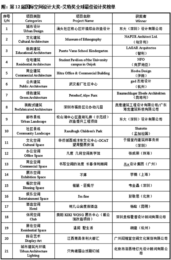 12月28日,全球空間設(shè)計(jì)業(yè)界矚目“設(shè)計(jì)之都”深圳。這里,有著國際空間設(shè)計(jì)“奧斯卡”之稱的第12屆國際空間設(shè)計(jì)大獎(jiǎng)艾特獎(jiǎng)?lì)C獎(jiǎng)盛典全球直播,70個(gè)國家和地區(qū)7461件參賽設(shè)計(jì)作品競逐城市設(shè)計(jì)、建筑設(shè)計(jì)、景觀設(shè)計(jì)、室內(nèi)設(shè)計(jì)、光環(huán)境設(shè)計(jì)等五大類23個(gè)專業(yè)設(shè)計(jì)大獎(jiǎng)。最終,21項(xiàng)作品攬得全球最佳設(shè)計(jì)大獎(jiǎng)。