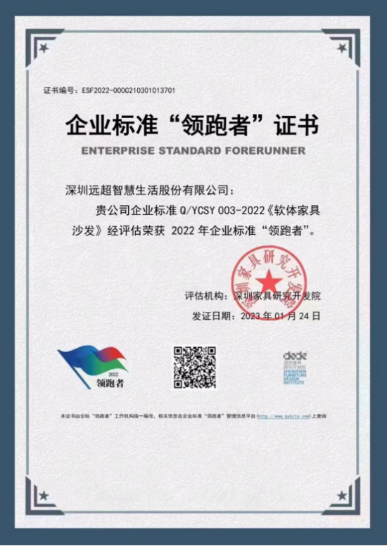 近期,中國標準化研究院企業(yè)標準領(lǐng)跑者管理信息平臺公布2022年企業(yè)標準“領(lǐng)跑者”名單,深圳遠超智慧生活股份有限公司(即CBD家居)憑借企業(yè)標準Q/YCSY 003-2022《軟體家具 沙發(fā)》榮獲企業(yè)標準“領(lǐng)跑者”證書,展現(xiàn)了CBD家居的企業(yè)高標準技術(shù)實力。
