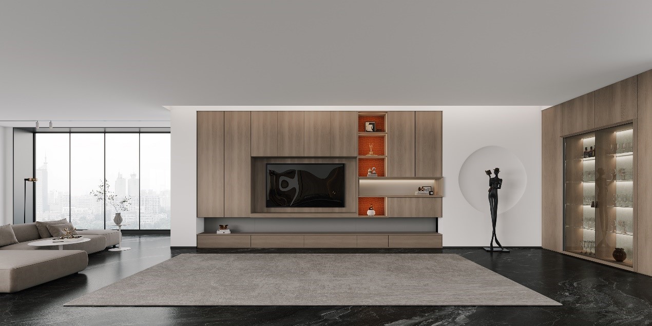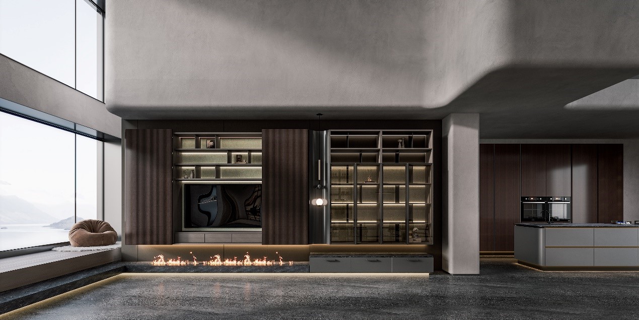 這套產(chǎn)品主要針對大平層的戶型設(shè)計(jì),開放式的客廳,開放式的廚房,開放式的臥室,開放式的衣帽間,一種無拘無束的感受,也是當(dāng)下年輕人比較鐘愛的生活方式。這款產(chǎn)品有兩大特點(diǎn):幾何式的產(chǎn)品結(jié)構(gòu),讓產(chǎn)品構(gòu)建更加簡潔干凈;層板內(nèi)斜45度的工藝亮點(diǎn),讓視覺感更加的聚焦,更加有內(nèi)部延伸感。