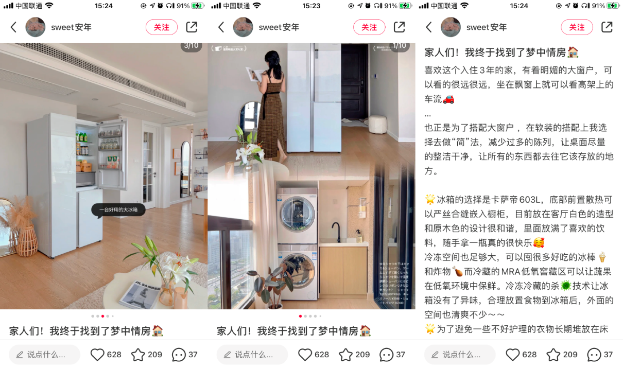 通過(guò)這些源自真實(shí)生活的家居案例,小紅書在品牌與用戶之間架起了以情感共識(shí)構(gòu)成的鏈接。這種「鏈接」經(jīng)由情緒共鳴,在潛移默化間占據(jù)消費(fèi)者心智,讓消費(fèi)者對(duì)卡薩帝光年套系產(chǎn)品產(chǎn)生人性化的感知,透過(guò)物質(zhì)表象,看見(jiàn)它們?cè)谧约荷钪械纳顚觾r(jià)值。