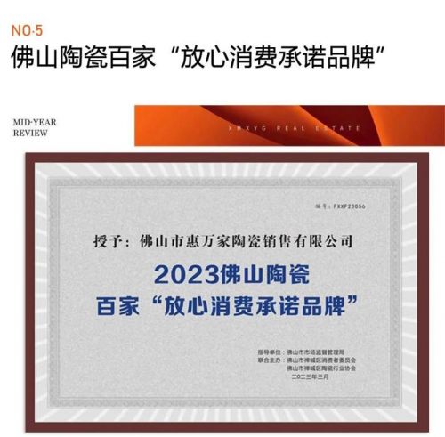 ■315國際消費(fèi)者權(quán)益日,惠萬家瓷磚憑借更專業(yè)的服務(wù)保障和高質(zhì)量的產(chǎn)品品質(zhì),被授于“2023佛山陶瓷百家放心消費(fèi)承諾品牌”,以實(shí)力向消費(fèi)者展現(xiàn)了品牌的專業(yè)度及美譽(yù)度。