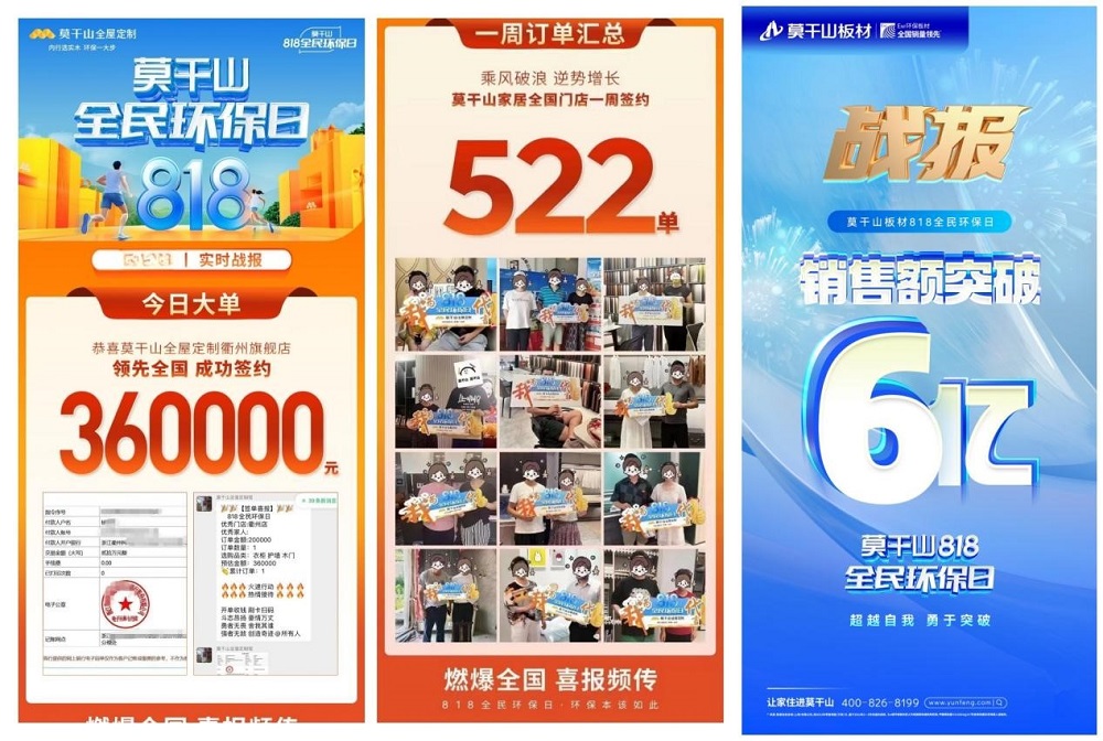 這場(chǎng)看似是數(shù)字角逐的戰(zhàn)役背后,實(shí)則是全渠道的博弈。本次云峰莫干山818全民環(huán)保日,完善布局,實(shí)現(xiàn)全渠道統(tǒng)一發(fā)力,不斷打響多維立體的市場(chǎng)攻堅(jiān)戰(zhàn)。借助電商大數(shù)據(jù)與傳統(tǒng)渠道相互賦能,全方位打通線上線下銷售渠道,實(shí)現(xiàn)了數(shù)字化運(yùn)營(yíng)閉環(huán),聯(lián)動(dòng)多個(gè)官方線上渠道以及線下千家門店, 實(shí)施超大力度優(yōu)惠活動(dòng),真實(shí)讓利消費(fèi)者。以秒殺、買贈(zèng)、大額優(yōu)惠券、抽獎(jiǎng)免單等空前福利作為殺手锏直擊人心,一場(chǎng)福利盛宴吹響云峰莫干山進(jìn)攻的號(hào)角。第二屆云峰莫干山818全民環(huán)保日,延續(xù)首屆惠民+環(huán)保的主旨,通過(guò)工廠直供產(chǎn)品、總部直播支持、線上旗艦店與線下門店多方聯(lián)動(dòng)的方式,充分釋放國(guó)民品牌熱度,實(shí)現(xiàn)銷量與口碑的雙贏。在短短幾天的活動(dòng)中,云峰莫干山全國(guó)門店簽單不停,戰(zhàn)報(bào)連連,無(wú)論是新房裝修還是老房煥新等客戶,都紛紛選擇搶在活動(dòng)期間下單,場(chǎng)面陣容之盛大,活動(dòng)反響之熱烈,堪稱業(yè)內(nèi)萬(wàn)眾矚目的一次盛會(huì)。