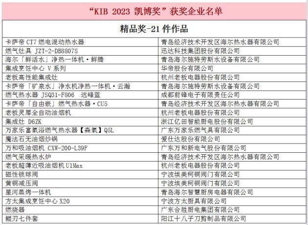 作為行業(yè)風(fēng)向標(biāo)和晴雨表的中國(guó)國(guó)際廚衛(wèi)家居博覽會(huì)展會(huì),本屆展會(huì)的舉行對(duì)廚衛(wèi)行業(yè)和市場(chǎng)下一步的發(fā)展具有重要的引導(dǎo)意義。為此,主辦方在今年這樣重要的展會(huì)年上,專(zhuān)門(mén)設(shè)立了凱博獎(jiǎng)。凱博獎(jiǎng)獲獎(jiǎng)作品具備行業(yè)創(chuàng)新性和引領(lǐng)性,在產(chǎn)品質(zhì)量、產(chǎn)品性能、節(jié)能環(huán)保等方面具備較強(qiáng)實(shí)力。首批共發(fā)布精品獎(jiǎng)20個(gè),優(yōu)品獎(jiǎng)和新品獎(jiǎng)21個(gè)。