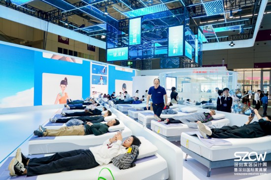 舒福德智能床開(kāi)放式展區(qū),躺滿了試睡體驗(yàn)的參展觀眾。
