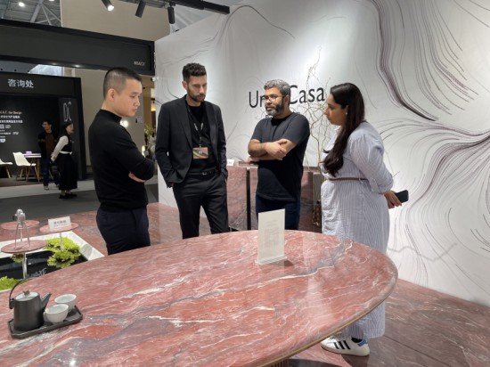 在其展位上,一張淺白色大理石餐桌紋理細膩,透出溫潤光澤。遠看,“桌腿”藏在輕盈的天鵝絨簾中,石板就像飄浮在空中。