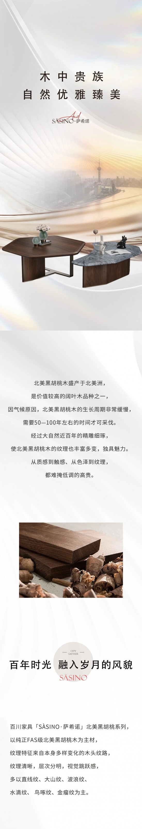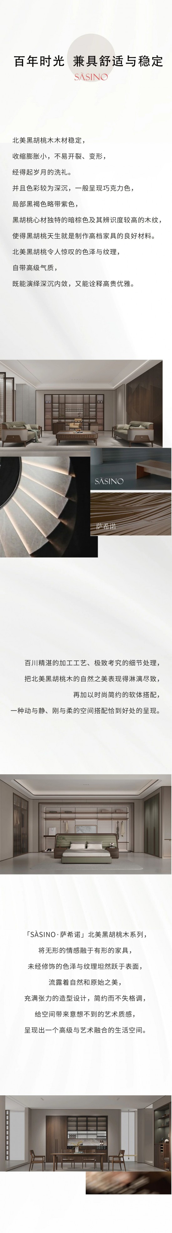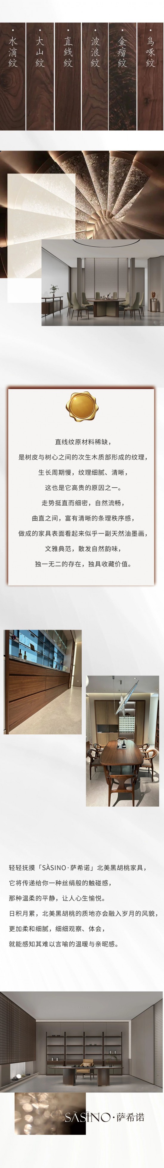 核心提示:百川家具「SSINO·薩希諾」北美黑胡桃系列,以純正FAS級北美黑胡桃木為主材,紋理特征來自本身多樣變化的木頭紋路,紋理清晰,層次分明,視覺跳躍感多以直線紋、大山紋、波浪紋、水滴紋、鳥啄紋、金瘤紋為主。