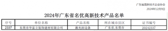 12月9日,廣東省高新技術企業(yè)協(xié)會正式公布了2024年廣東省名優(yōu)高新技術產(chǎn)品名單,東莞市華富立裝飾建材有限公司(以下簡稱“東莞華富立”)自主研發(fā)的華立激光封邊條憑借其卓越的技術水平和市場競爭力成功入選,為公司的科技創(chuàng)新之路再添榮譽。