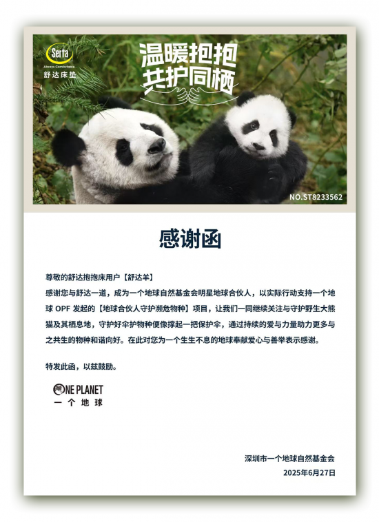 溫暖抱抱,共護(hù)同棲,舒達(dá)攜手「一個地球自然基金會(OPF)」助力熊貓棲息地守護(hù)者計劃。即日起至12月31日,消費(fèi)者每購買一張舒達(dá)抱抱床,即可在購買門店領(lǐng)取由一個地球自然基金會(OPF)頒發(fā)的明星地球合伙人電子感謝函,該證書附有舒達(dá)活動專屬的生態(tài)貢獻(xiàn)編碼。同時,抱抱床上市期間,舒達(dá)將提取抱抱床產(chǎn)品的部分收益,定向注入“大熊貓守護(hù)者計劃”,資金將主要用于大熊貓棲息地生態(tài)環(huán)境巡護(hù),支持巡護(hù)隊完成森林巡護(hù)及巡護(hù)員能力建設(shè)培訓(xùn)等工作。同步打造“溫暖抱抱”體驗空間,將熊貓棲息地的溫度,搬進(jìn)每一間臥室。