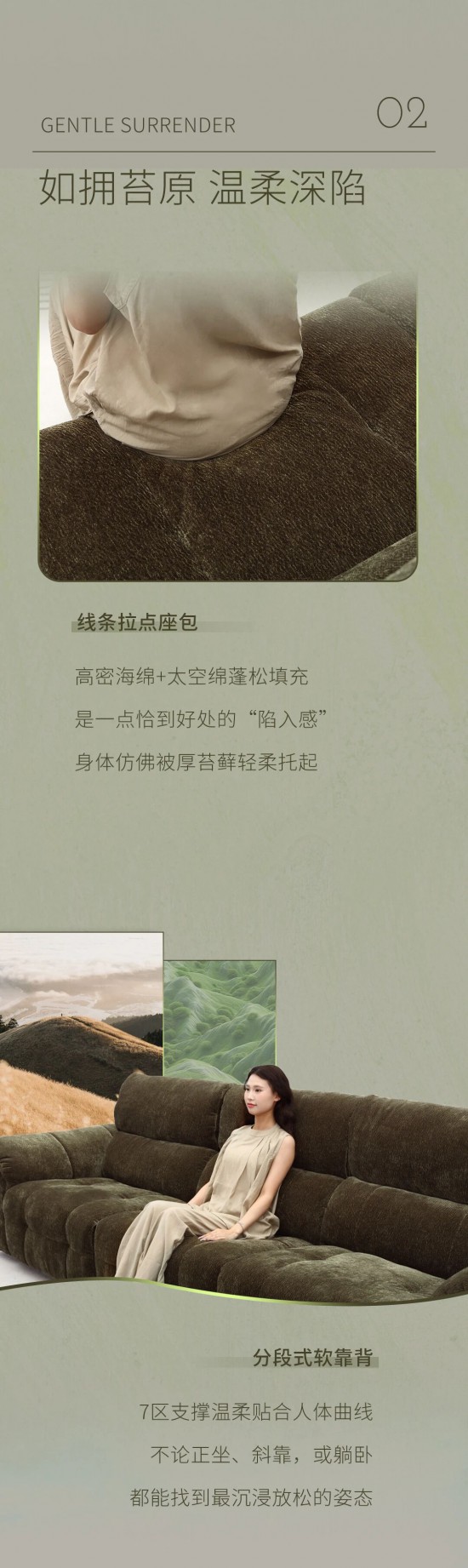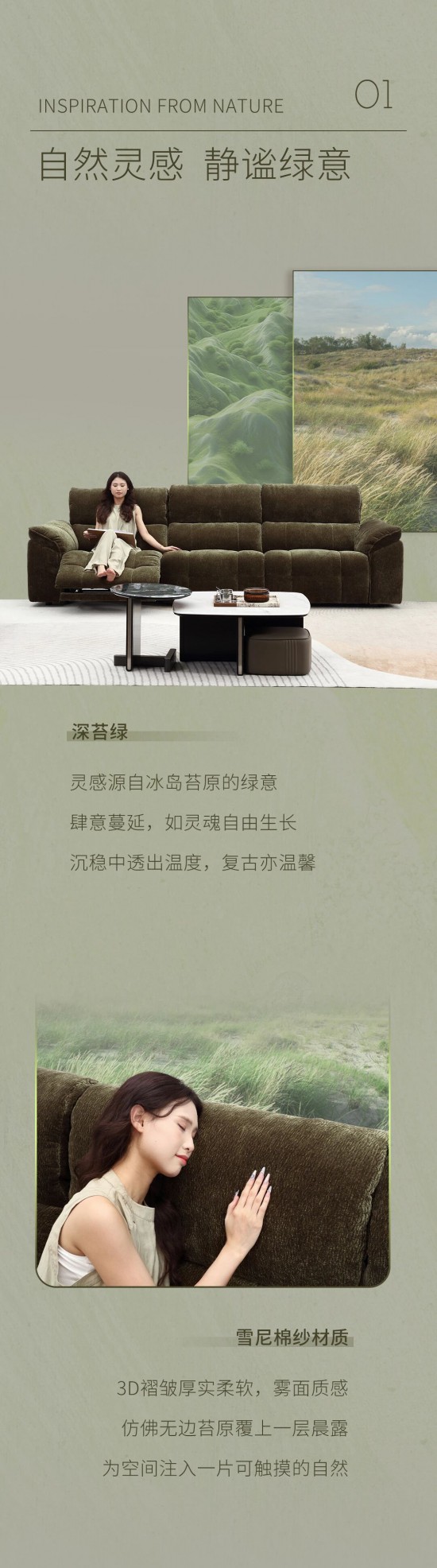 核心提示:深苔綠沙發(fā),靈感源自冰島苔原的綠意,肆意蔓延,如靈魂自由生長(zhǎng),沉穩(wěn)中透出溫度,復(fù)古亦溫馨。