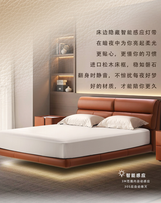 床邊隱藏智能感應(yīng)燈帶,在暗夜中為你亮起柔光,更貼心,更懂你的習(xí)慣。進(jìn)口松木床框,穩(wěn)如磐石,翻身時(shí)靜音,不驚擾每夜好夢(mèng)。好的材質(zhì),才能陪你更久 。智能感應(yīng),3M范圍內(nèi)自動(dòng)感應(yīng),30S后自動(dòng)熄滅。