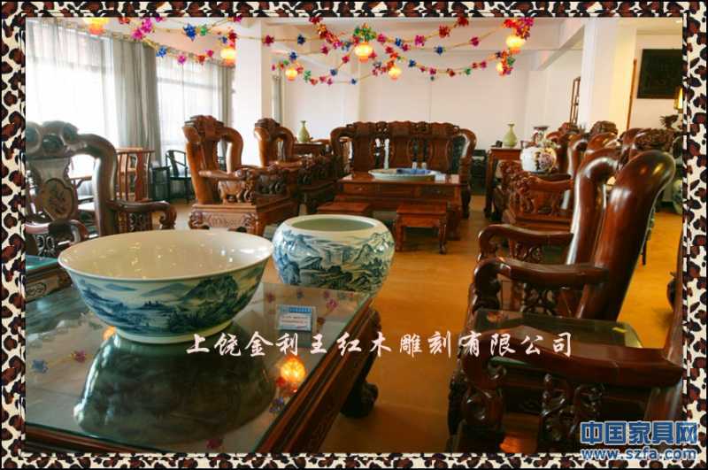 上饒市金利王紅木雕刻有限公司,座落于江西省上饒市經(jīng)濟(jì)開發(fā)區(qū)鳳凰園區(qū),是一家專門從事中高檔紅木家具生產(chǎn)的專業(yè)廠家。本公司視質(zhì)量與信譽(yù)為企業(yè)生存和發(fā)展的根本,潛心為客戶的利益而開發(fā)創(chuàng)新各種款式別致的優(yōu)質(zhì)產(chǎn)品。本公司產(chǎn)品選材于東南亞進(jìn)口的黃花梨、紫檀、酸枝、緬甸花梨等珍貴紅木,其特點(diǎn)色澤深沉、質(zhì)地精密、紋理細(xì)膩。公司擁有精湛的技術(shù),產(chǎn)品手工制作,名師打理,設(shè)計(jì)精美,制作精巧,榫卯牢固,舒適耐用。既傳承傳統(tǒng)的雕刻技術(shù),研發(fā)古典藝術(shù)家具,又融入了新的潮流構(gòu)思,其人、物、花、鳥栩栩如生,龍、鳳、獅、虎神采飛揚(yáng),富含東方神韻,各類產(chǎn)品深受廣大消費(fèi)者和藝術(shù)愛好者的親睞。