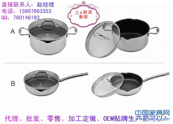 高檔不銹鋼廚具、湯鍋、炒鍋、煎鍋、奶鍋、蒸鍋、刀叉、碗筷碟子等眾多款式,批發(fā)、零售、代理還可以加工定做,OEM貼牌生產(chǎn)!廠家直銷?。?!櫥柜、炊具等產(chǎn)品配套的最佳選擇!消費者最愛的禮品,贈品!