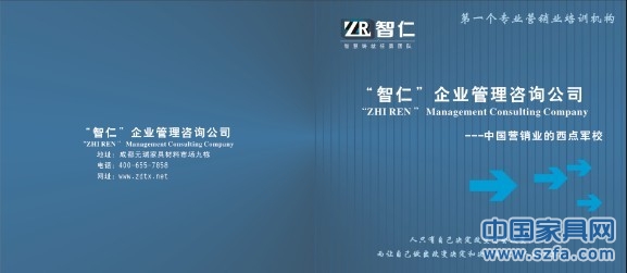 年因公司發(fā)展,在四川成都,設(shè)立:“智仁•中國(guó)”企業(yè)管理咨詢公司。本公司一直致力研究:家具行業(yè)銷售與管理、市場(chǎng)拓展與維護(hù)、企業(yè)文化建設(shè)與傳承。經(jīng)過(guò)數(shù)十年的研究、論證與各種戰(zhàn)略,戰(zhàn)術(shù)的實(shí)施,對(duì)家具行業(yè)所面臨的瓶頸以及全套解決方案已擁有大量的實(shí)戰(zhàn)型模塊,以及大量的實(shí)戰(zhàn)型人才。對(duì)解決:家具企業(yè)發(fā)展管理模塊建立、團(tuán)隊(duì)建設(shè)與打造、市場(chǎng)拓展與維護(hù)、企業(yè)文化建立與傳承、終端管理與建設(shè)等所有瓶頸與困難擁有一套:實(shí)際操作性最強(qiáng)、企業(yè)承擔(dān)成本最低、收效最快的整體解決方案。
