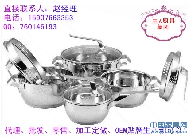 高檔不銹鋼廚具、湯鍋、炒鍋、煎鍋、奶鍋、蒸鍋、刀叉、碗筷碟子等眾多款式,批發(fā)、零售代理還可以加工定做,OEM貼牌生產(chǎn)!廠家直銷?。?!櫥柜、炊具等產(chǎn)品配套的最佳選擇!消費(fèi)者最愛的禮品,贈品!